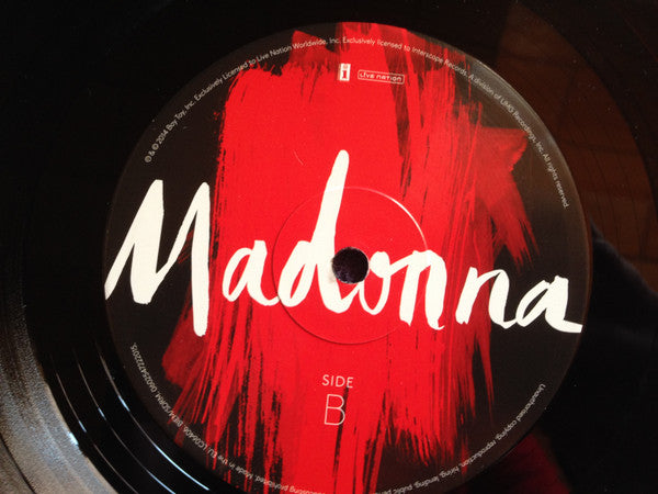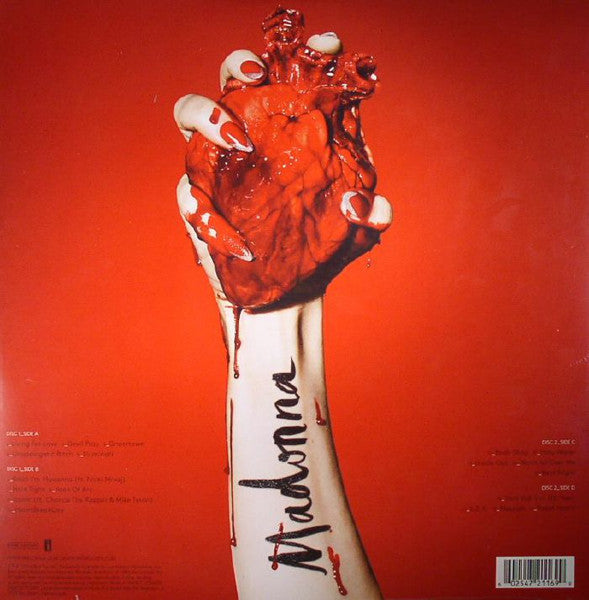 A1. Living For Love 3:40 A2. Devil Pray 4:02 A3. Ghosttown 4:08 A4. Unapologetic Bitch 3:53 A5. Illuminati 3:44 B1. Bitch I'm Madonna 3:48 B2. Hold Tight 3:36 B3. Joan Of Arc 4:00 B4. Iconic 4:33 B5. HeartBreakCity 3:32 C1. Body Shop 3:38 C2. Holy Water 4:08 C3. Inside Out 4:20 C4. Wash All Over Me 3:58 C5. Best Night 3:34 D1. Veni Vidi Vici 4:38 D2. S.E.X. 4:10 D3. Messiah 3:23 D4. Rebel Heart 3:16