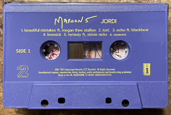 Maroon 5’s seventh album Jordi, released through their webstore on a lavender cassette.