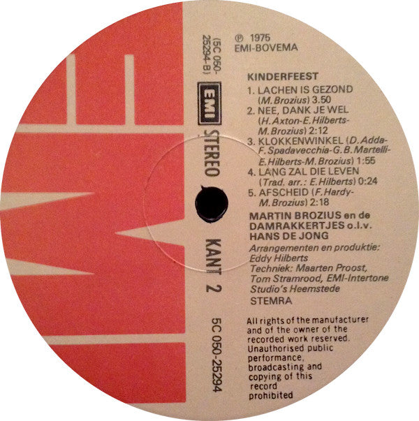 A1. Ren Je Rot 2:38 A2. Martin Is Jarig 3:15 A3. Beestenboel 2:03 A4. Studentengrap 1:38 A5. Huisorkest 2:44 B1. Lachen Is Gezond 3:50 B2. Nee, Dank Je Wel 2:12 B3. Klokkenwinkel 1:55 B4. Lang Zal Die Leven 0:24 B5. Afscheid 2:18