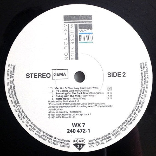 A1. Whose Side Are You On? (Extended Version) 4:32 A2. More Than I Can Bear 4:15 A3. No No Never 3:43 A4. Half A Minute 3:49 A5. Matt's Mood 5:19 B1. Get Out Of Your Lazy Bed 3:25 B2. It's Getting Late 3:20 B3. Sneaking Out Of The Back Door 3:46 B4. Riding With The Wind 3:22 B5. Matts Mood II 5:15