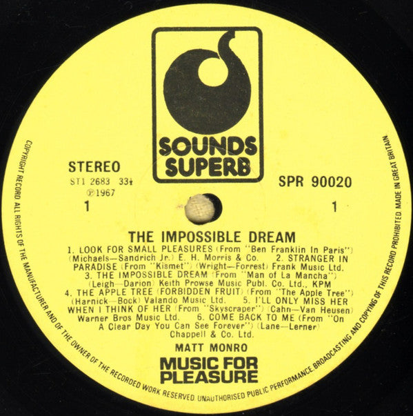 A1. Look For Small Pleasures A2. Stranger In Paradise A3. The Impossible Dream A4. The Apple Tree A5. I'll Only Miss Her When I Think Of Her A6. Come Back To Me B1. Hello, Dolly B2. Sunrise, Sunset B3. Walking Happy B4. If She Walked Into My Life B5. Put On A Happy Face