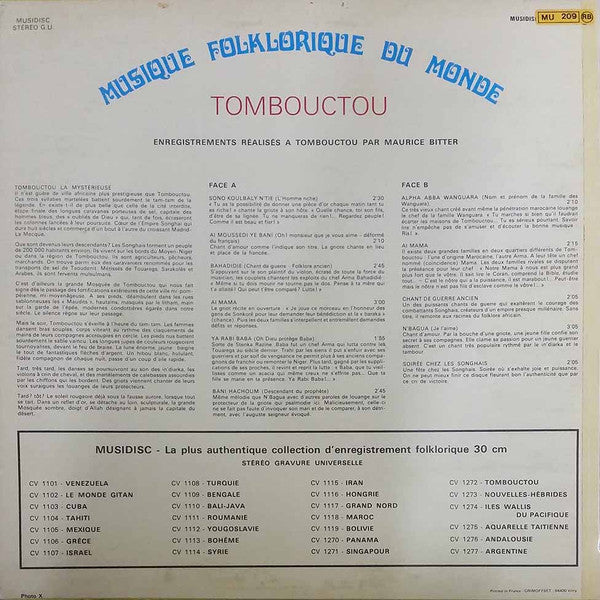 A1. Sono Koulbaly N'Tie 2:30 A2. Al Moussedi Ye Bani 2:10 A3. Bahadudue 2:45 A4. Al Mama 3:00 A5. Ya Rabi Baba 1:55 A6. Bani Hachoum 2:45 B1. Alpha Abba Wanguara 2:10 B2. Al Mama 2:15 B3. Chant De Guerre Ancien 2:05 B4. N'Bagua 3:05 B5. Soirée Chez Les Songhais 2:05
