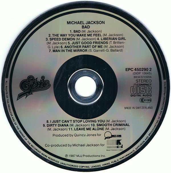 Produced for Quincy Jones Productions. Co-produced for MJJ Productions. Recorded and mixed using the "Acoustic Recording Process D" ℗ © 1987 MJJ Productions Inc. Made in Switzerland / Printed in Holland