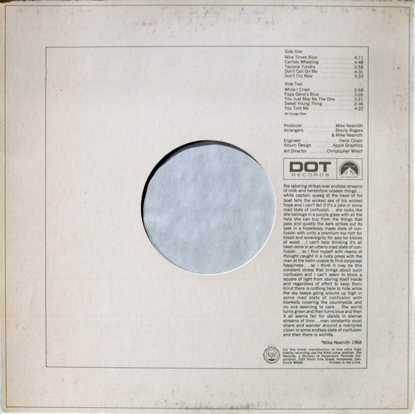 Die cut Unipak sleeve. Full name of the album: Mike Nesmith Presents The Wichita Train Whistle Sings. On the label the album is credited to The Wichita Train Whistle. Catalog number on the labels: DLP 25,861 Catalog number on the spine: DLP 25861