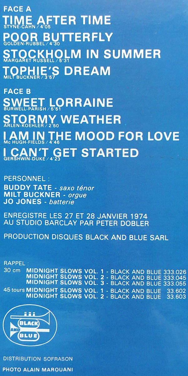 Very similar to [r19953595 but different in the white label rim text Enregistre les 27 et 28 Janvier 1974 au studio Barclay. Buddy Tate is not officially credited playing clarinet on this record, but he surely plays it on B1 and B2. Some copies have 33.068 instead of 333.068 as catalogue number.