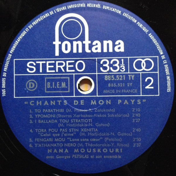 A1. Vrexi Stin Ftoxo Gitonia (Petits Enfants Du Monde Entier) 3:55 A2. Itan Kamari Tis Avgis 3:10 A3. Lavrion 2:40 A4. Me T'Aspro Mou Mantili 2:27 A5. Ena To Chelidoni 2:55 A6. Pame Mia Volta Sto Fengari 2:55 B1. To Parathiri 2:10 B2. Ypomoni 2:40 B3. I Ballada Tou Stratioti (La Ballade Du Soldat) 3:27 B4. Tora Pou Pas Stin Xenitia 2:40 B5. Fengari Mou 2:50 B6. T'Athanato Nero 3:37