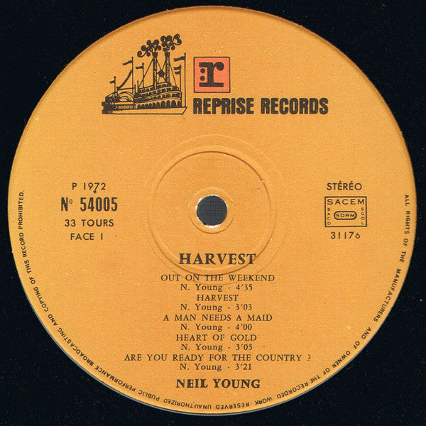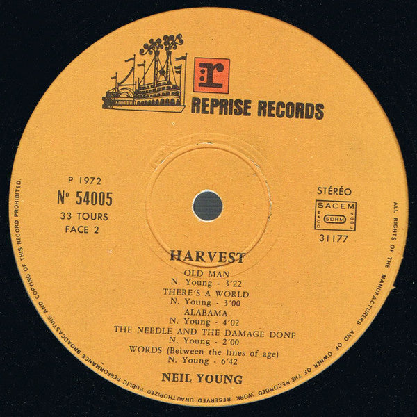 A1. Out On The Weekend 4:35 A2. Harvest 3:03 A3. A Man Needs A Maid 4:00 A4. Heart Of Gold 3:05 A5. Are You Ready For The Country? 3:21 B1. Old Man 3:22 B2. There's A World 3:00 B3. Alabama 4:02 B4. The Needle And The Damage Done 2:00 B5. Words (Between The Lines Of Age) 6:42