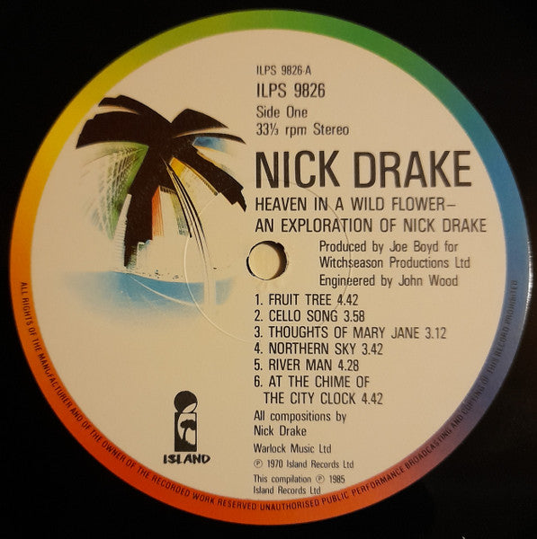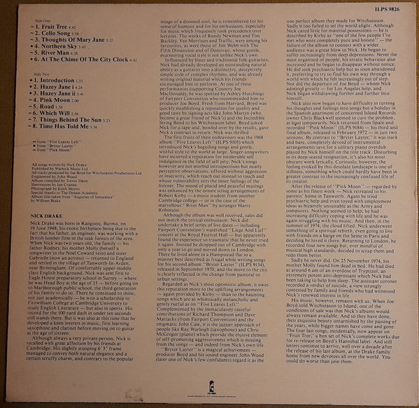A1. Fruit Tree 4:42 A2. Cello Song 3:58 A3. Thoughts Of Mary Jane 3:12 A4. Northern Sky 3:42 A5. River Man 4:28 A6. At The Chime Of The City Clock 4:42 B1. Introduction 1:33 B2. Hazey Jane I 4:24 B3. Hazey Jane II 3:41 B4. Pink Moon 2:00 B5. Road 1:58 B6. Which Will 2:56 B7. Things Behind The Sun 3:23 B8. Time Has Told Me 3:56