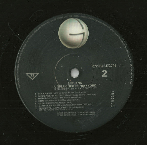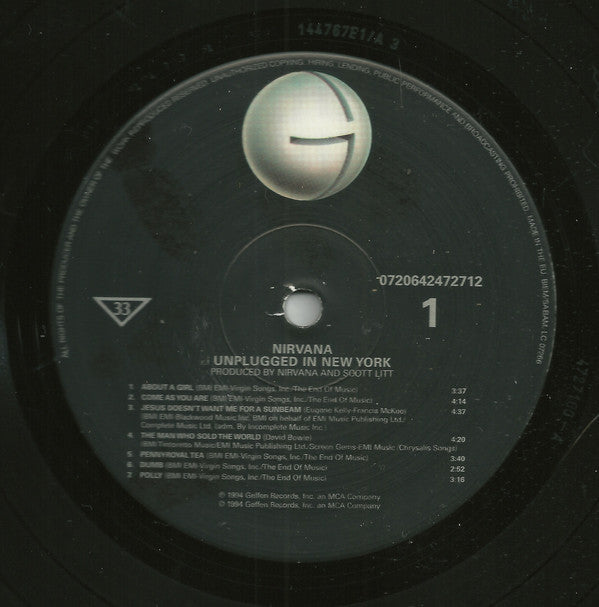 A1. About A Girl 3:37 A2. Come As You Are 4:14 A3. Jesus Doesn't Want Me For A Sunbeam 4:37 A4. The Man Who Sold The World 4:20 A5. Pennyroyal Tea 3:40 A6. Dumb 2:52 A7. Polly 3:16 B1. On A Plain 3:44 B2. Something In The Way 4:01 B3. Plateau 3:38 B4. Oh Me 3:26 B5. Lake Of Fire 2:55 B6. All Apologies 4:23 B7. Where Did You Sleep Last Night 5:07