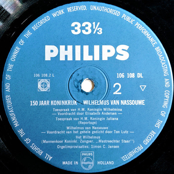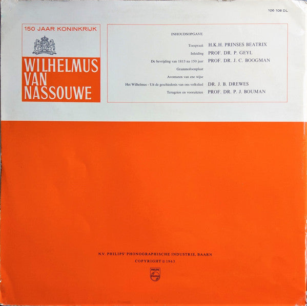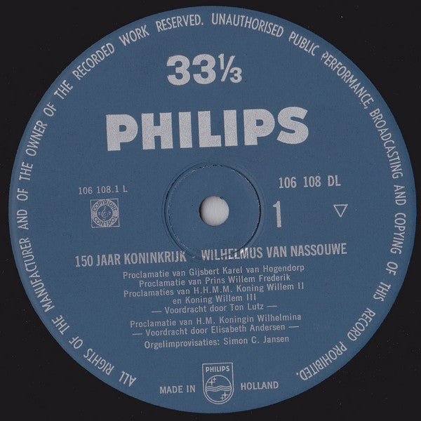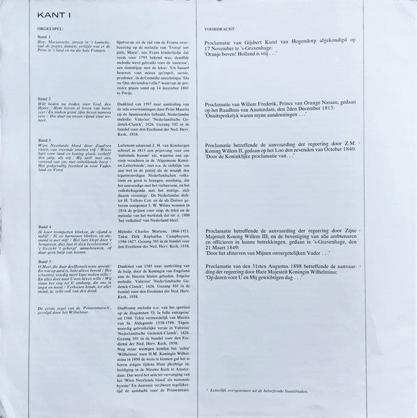 A1. Proclamatie Van Gijsbert Karel Van Hogendorp A2. Proclamatie Van Prins Willem Hendrik A3. Proclamatie Van H.H.M.M. Koning Willem II A4. Proclamatie Van H.H.M.M. Koning Willem III A5. Proclamatie Van H.M. Koningin Wilhelmina B1. Toespraak Van H.M. Koningin Wilhelmina B2. Toespraak Van H.M. Koningin Juliana B3a. Wilhelmus Van Nassouwe B3b. Het Wilhelmus