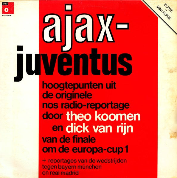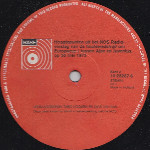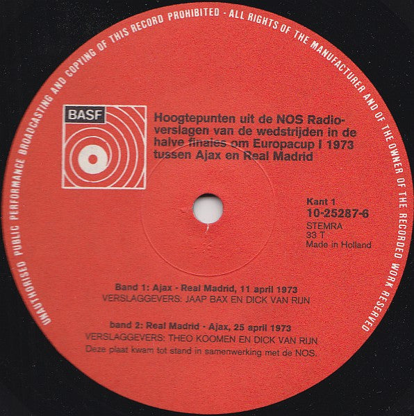 A1. Band 1: Ajax - Real Madrid, 11 April 1973 A2. Band 2: Real Madrid - Ajax, 25 April 1973 B. Hoogtepunten uit het N.O.S. radioverslag van de finalewedstrijd om Europacup 1 tussen Ajax en Juventus, op 30 Mei 1973. . 7" single: Ajax - Bayern Munchen / Bayern Munchen - Ajax A. Ajax - Bayern Munchen B. Bayern Munchen - Ajax
