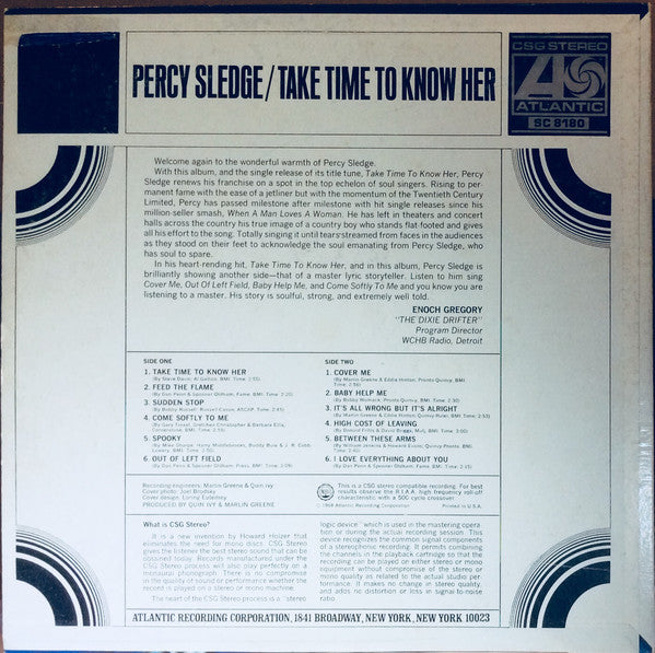 A1. Take Time To Know Her 2:55 A2. Feed The Flame 2:20 A3. Sudden Stop 2:45 A4. Come Softly To Me 2:55 A5. Spooky 2:50 A6. Out Of Left Field 3:09 B1. Cover Me 2:56 B2. Baby Help Me 2:30 B3. It's All Wrong But It's Alright 2:53 B4. High Cost Of Leaving 3:00 B5. Between These Arms 2:40 B6. I Love Everything About You 2:15
