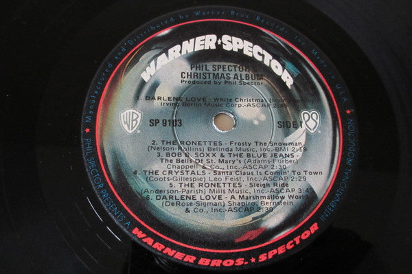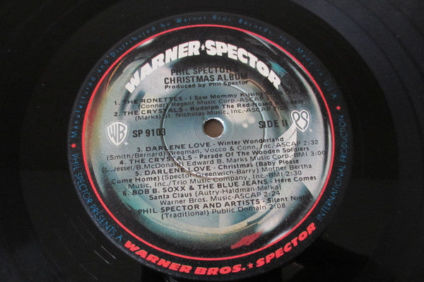 A1. Darlene Love - White Christmas 2:45 A2. The Ronettes - Frosty The Snowman 2:19 A3. Bob B. Soxx And The Blue Jeans - The Bells Of St. Mary's 2:30 A4. The Crystals - Santa Claus Is Coming To Town 2:29 A5. The Ronettes - Sleigh Ride 3:45 A6. Darlene Love - Marshmallow World 2:30 B1. The Ronettes - I Saw Mommy Kissing Santa Claus 2:29 B2. The Crystals - Rudolph The Red-Nosed Reindeer 2:20 B3. Darlene Love - Winter Wonderland 2:32 B4. The Crystals - Parade Of The Wooden Soldiers 3:00 B5. Darlene Love - Christmas (Baby Please Come Home) 2:30 B6. Bob B. Soxx And The Blue Jeans - Here Comes Santa Claus 2:24 B7. Phil Spector And Artists - Silent Night 2:08