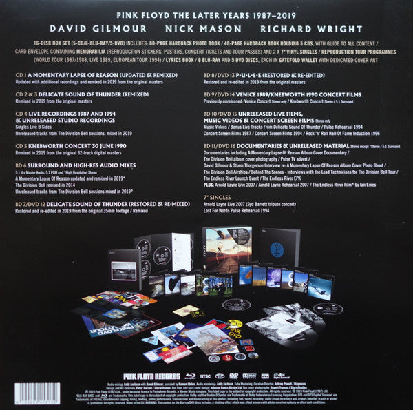 . A Momentary Lapse Of Reason (Remixed & Updated) CD1-1. Signs Of Life 4:23CD1-2. Learning To Fly 4:52CD1-3. The Dogs Of War 6:04CD1-4. One Slip 5:10CD1-5. On The Turning Away 5:42CD1-6. Yet Another Movie 6:15CD1-7. Round And Around 1:12CD1-8. A New Machine Part 1 1:46CD1-9. Terminal Frost 6:16CD1-10. A New Machine Part 2 0:39CD1-11. Sorrow 8:47. Delicate Sound Of Thunder (Remixed) CD2-1. Shine On You Crazy Diamond, Parts 1-5 12:09CD2-2. Signs Of Life 3:19CD2-3. Learning To Fly 5:15CD2-4. Yet Another Movie 6:16CD2-5. Round And Around 0:34CD2-6. A New Machine Part 1 1:35CD2-7. Terminal Frost 6:17CD2-8. A New Machine Part 2 0:34CD2-9. Sorrow 10:25CD2-10. The Dogs Of War 8:02CD2-11. On The Turning Away 9:13CD3-1. One Of These Days 6:18CD3-2. Time 5:18CD3-3. On The Run 2:49CD3-4. The Great Gig In The Sky 4:51CD3-5. Wish You Were Here 4:38CD3-6. Welcome To The Machine 7:45CD3-7. Us And Them 7:37CD3-8. Money 8:18CD3-9. Another Brick In The Wall, Part 2 5:26CD3-10. Comfortably Numb 9:54CD3-11. One Slip 6:08CD3-12. Run Like Hell 8:10. Live Recordings, 1987 & 1994 / Unreleased Studio Recordings CD4-1. One Of These Days (Live In Hanover 1994) 6:57CD4-2. Astronomy Domine (Live In Miami 1994) 4:48CD4-3. The Dogs Of War (Live In Atlanta 1987) 7:10CD4-4. On The Turning Away (Live In Atlanta 1987) 6:52CD4-5. Run Like Hell (Live In Atlanta 1987) 7:23CD4-6. Blues 1 (Unreleased 1994 Recording) 5:23CD4-7. Slippery Guitar (Unreleased 1994 Recording) 6:40CD4-8. Rick’s Theme (Unreleased 1994 Recording) 2:33CD4-9. David’s Blues (Unreleased 1994 Recording) 4:28CD4-10. Marooned Jam (Unreleased 1994 Recording) 3:18CD4-11. Nervana (Unreleased 1994 Recording) 4:56CD4-12. High Hopes (Early Version) (Unreleased 1994 Recording) 6:55. Knebworth Concert 1990 CD5-1. Shine On You Crazy Diamond, Parts 1-5 11:06CD5-2. The Great Gig In The Sky 5:04CD5-3. Wish You Were Here 4:47CD5-4. Sorrow 9:34CD5-5. Money 10:10CD5-6. Comfortably Numb 7:47CD5-7. Run Like Hell 7:14. Surround & Hi-Res Audio Mixes . Surround: dts Master Audio 5.1 (96/24), PCM 5.1 (96/24) PCM Stereo (96/24) . A Momentary Lapse Of Reason Updated & Remixed 2019 First Release Of 2019 Mixes In 5.1 BR1-1. Signs Of Life 4:22BR1-2. Learning To Fly 4:53BR1-3. The Dogs Of War 6:05BR1-4. One Slip 5:10BR1-5. On The Turning Away 5:43BR1-6. Yet Another Movie 6:15BR1-7. Round And Around 1:13BR1-8. A New Machine Part 1 1:47BR1-9. Terminal Frost 6:16BR1-10. A New Machine Part 2 0:40BR1-11. Sorrow 8:47. The Division Bell 2014 Remix BR1-12. Cluster One 5:59BR1-13. What Do You Want From Me 4:15BR1-14. Poles Apart 7:12BR1-15. Marooned 5:29BR1-16. A Great Day For Freedom 4:20BR1-17. Wearing The Inside Out 6:49BR1-18. Take It Back 6:13BR1-19. Coming Back To Life 6:20BR1-20. Keep Talking 6:11BR1-21. Lost For Words 5:14BR1-22. High Hopes 8:29. Unreleased Material BR1-23. Blues 1 (Unreleased 1994 Recording 5.1 Mix) 5:21BR1-24. Slippery Guitar (Unreleased 1994 Recording 5.1 Mix) 6:41BR1-25. Rick’s Theme (Unreleased 1994 Recording 5.1 Mix) 2:34BR1-26. David’s Blues (Unreleased 1994 Recording 5.1 Mix) 4:29BR1-27. Marooned Jam (Unreleased 1994 Recording 5.1 Mix) 3:17BR1-28. Nervana (Unreleased 1994 Recording 5.1 Mix) 4:57BR1-29. High Hopes (Early Version) (Alternative Version 5.1 Mix) 6:54. Delicate Sound Of Thunder (Restored & Remixed) . Stereo: PCM 96/24 Surround: DTS Master Audio 5.1 (96/24) BR2-1. Shine On You Crazy Diamond, Parts 1-5 12:23BR2-2. Signs Of Life 3:23BR2-3. Learning To Fly 5:17BR2-4. Sorrow 10:24BR2-5. The Dogs Of War 8:04BR2-6. On The Turning Away 9:23BR2-7. One Of These Days 5:56BR2-8. Time 5:21BR2-9. On The Run 2:46BR2-10. The Great Gig In The Sky 4:48BR2-11. Wish You Were Here 4:50BR2-12. Us And Them 7:33BR2-13. Money 8:27BR2-14. Comfortably Numb 9:54BR2-15. One Slip 6:09BR2-16. Run Like Hell 10:49. Pulse (Restored & Re-Edited) . Filmed Live On 20 October 1994 At Earls Court, London, Uk . Stereo: PCM 48/24. Surround: DTS Master Audio 5.1 (96/24) BR3-1. Shine On You Crazy Diamond, Parts 1-5, 7 13:24BR3-2. Learning To Fly 5:40BR3-3. High Hopes 8:12BR3-4. Take It Back 5:56BR3-5. Coming Back To Life 6:55BR3-6. Sorrow 11:09BR3-7. Keep Talking 7:42BR3-8. Another Brick In The Wall, Part 2 6:46BR3-9. One Of These Days 7:12BR3-10. Speak To Me 1:41BR3-11. Breathe (In The Air) 2:39BR3-12. On The Run 3:42BR3-13. Time 6:40BR3-14. The Great Gig In The Sky 5:19BR3-15. Money 8:49BR3-16. Us And Them 7:00BR3-17. Any Colour You Like 3:17BR3-18. Brain Damage 3:47BR3-19. Eclipse 3:04BR3-20. Wish You Were Here 6:06BR3-21. Comfortably Numb 9:36BR3-22. Run Like Hell 9:17. Venice Concert 1989 / Knebworth Concert 1990 . Live In Venice 15 July 1989 . Stereo Only: PCM 48/24 BR4-1. Shine On You Crazy Diamond, Part 1 2:56BR4-2. Learning To Fly 5:34BR4-3. Yet Another Movie 6:17BR4-4. Round And Around 0:34BR4-5. Sorrow 9:39BR4-6. The Dogs Of War 7:59BR4-7. On The Turning Away 7:30BR4-8. Time 5:40BR4-9. The Great Gig In The Sky 4:59BR4-10. Wish You Were Here 4:34BR4-11. Money 8:43BR4-12. Another Brick In The Wall, Part 2 5:17BR4-13. Comfortably Numb 9:11BR4-14. Run Like Hell 7:08BR4-15. Fireworks 3:46. Live At Knebworth 30 June 1990 . Stereo: PCM 48/24. Surround: DTS Master Audio 5.1 (48/24) BR4-16. Shine On You Crazy Diamond, Parts 1-5 11:03BR4-17. The Great Gig In The Sky 5:04BR4-18. Wish You Were Here 5:03BR4-19. Sorrow 9:30BR4-20. Money 10:13BR4-21. Comfortably Numb 8:14BR4-22. Run Like Hell 8:00. Unreleased Live Films, Music Videos & Concert Screen Films . Stereo PCM (48/24) . Music Videos BR5-1. Learning To Fly 4:30BR5-2. Marooned 5:25BR5-3. Take It Back 5:02BR5-4. High Hopes 7:49BR5-5. Louder Than Words 4:41BR5-6. Learning To Fly (Alternate Version) 4:32. Bonus Live Tracks From Delicate Sound Of Thunder BR5-7. Yet Another Movie 6:31BR5-8. Round And Around 0:34BR5-9. A New Machine Part 1 1:36BR5-10. Terminal Frost 6:17BR5-11. A New Machine Part2 0:40. Pulse Tour Rehearsal 1994 BR5-12. A Great Day For Freedom Version 1 5:08BR5-13. A Great Day For Freedom Version 2 4:59BR5-14. Lost For Wo