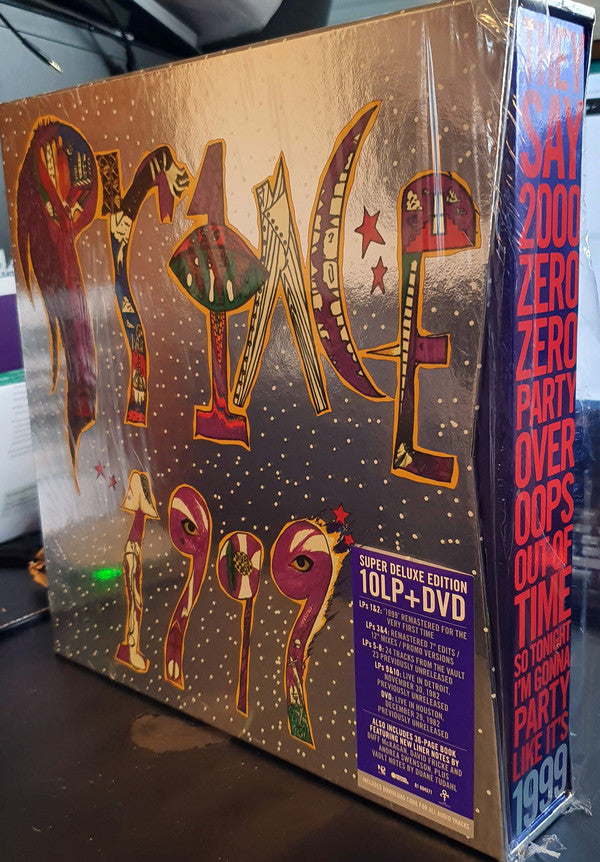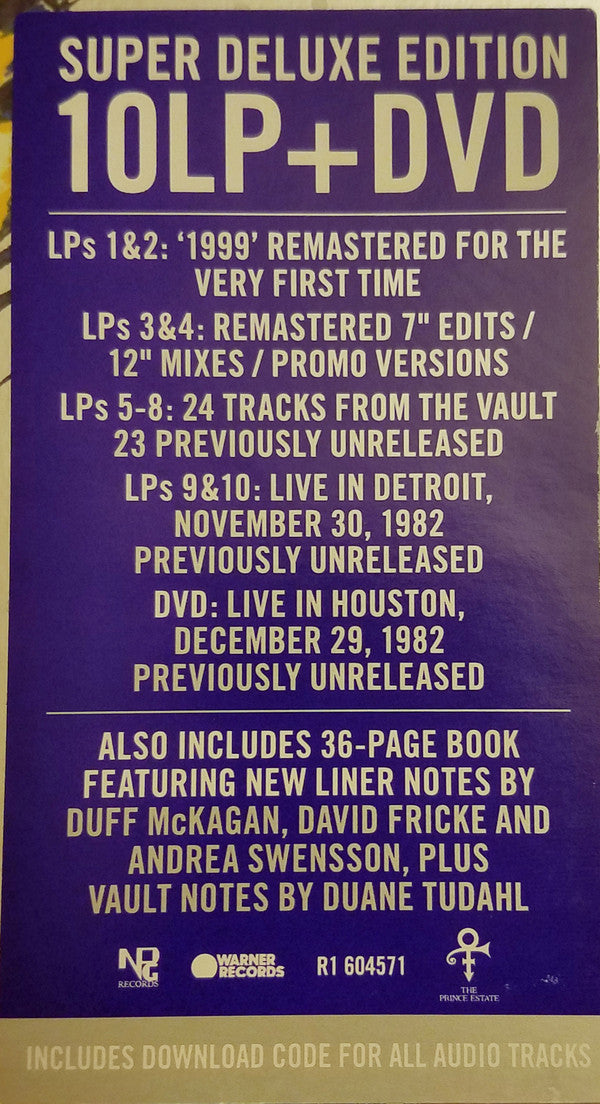A1. 1999 6:14 A2. Little Red Corvette 5:04 A3. Delirious 4:00 B1. Let's Pretend We're Married 7:20 B2. D.M.S.R. 8:18 C1. Automatic 9:26 C2. Something In The Water (Does Not Compute) 4:02 C3. Free 5:07 D1. Lady Cab Driver 8:17 D2. All The Critics Love U In New York 5:58 D3. International Lover 6:38 . 1999 Promo Mixes & B-Sides Remastered E1. 1999 (7" Stereo Edit) 3:37 E2. 1999 (7" Mono Promo-Only Edit) 3:35 E3. Free (Promo-Only Edit) 4:36 E4. How Come U Don't Call Me Anymore? 3:55 E5. Little Red Corvette (7" Edit) 3:08 F1. All The Critics Love U In New York (7" Edit) 3:16 F2. Lady Cab Driver (7" Edit) 5:06 F3. Little Red Corvette (Dance Remix Promo-Only Edit) 4:34 F4. Little Red Corvette (Special Dance Mix) 8:31 G1. Delirious (7" Edit) 2:39 G2. Horny Toad 2:15 G3. Automatic (7" Edit) 3:40 G4. Automatic (Video Version) 8:21 G5. Let's Pretend We're Married (7" Edit) 3:45 H1. Let's Pretend We're Married (7" Mono Promo-Only Edit) 3:44 H2. Irresistible Bitch 4:14 H3. Let's Pretend We're Married (Video Version) 4:03 H4. D.M.S.R. (Edit) 5:06 . 1999 Vault Tracks I I1. Feel U Up 6:42 I2. Irresistible Bitch 4:39 I3. Money Don't Grow On Trees 4:19 I4. Vagina 3:28 J1. Rearrange 6:11 J2. Bold Generation 5:54 J3. Colleen 5:30 K1. International Lover (Take 1, Live in Studio) 7:20 K2. Turn It Up 5:23 K3. You're All I Want 3:00 L1. Something In The Water (Does Not Compute) (Original Version) 4:00 L2. If It'll Make U Happy 4:12 L3. How Come U Don't Call Me Anymore? (Take 2, Live in Studio) 6:11 . 1999 Vault Tracks II M1. Possessed (1982 Version) 8:47 M2. Delirious (Full-Length) 6:00 N1. Purple Music 10:58 N2. Yah, You Know 3:11 N3. Moonbeam Levels 4:23 O1. No Call U 4:30 O2. Can't Stop This Feeling I Got 2:40 O3. Do Yourself A Favor 9:01 P1. Don't Let Him Fool Ya 4:35 P2. Teacher, Teacher 3:37 P3. Lady Cab Driver / I Wanna Be Your Lover / Head / Little Red Corvette (Tour Demo) 7:00 . 1999 Live In Detroit 11/30/82 Q1. Controversy 5:41 Q2. Let's Work 5:27 Q3. Little Red Corvette 4:18 Q4. Do Me, Baby 7:18 R1. Head 4:13 R2. Uptown 2:55 R3. Interlude 2:15 R4. How Come U Don't Call Me Anymore? 7:03 S1. Automatic 7:02 S2. International Lover 8:41 S3. 1999 10:25 T1. D.M.S.R. 8:03 . 1999 Live In Houston 12/29/82 DVD1-1. Controversy 4:53 DVD1-2. Let's Work 5:33 DVD1-3. Do Me, Baby 6:32 DVD1-4. D.M.S.R. 4:28 DVD1-5. Interlude 3:38 DVD1-6. Piano Improvisation 1:24 DVD1-7. How Come U Don't Call Me Anymore? 8:30 DVD1-8. Lady Cab Driver 2:59 DVD1-9. Automatic 6:05 DVD1-10. International Lover 9:48 DVD1-11. 1999 8:35 DVD1-12. Head 6:03