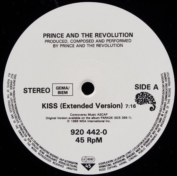 Sticker: incl. Super Poster Sleeve: Manufactured in Germany by Record Service GmbH, Alsdorf Pressé en Allemagne par Record Service GmbH, Alsdorf [Warner 'W' logo A Warner Communications Company Labels: Controversy Music ASCAP ℗ 1986 WEA International Inc. Made in Germany by WEA Musik GmbH [Warner 'W' logo A Warner Communications Company Side A, label: Original Version available on the album PARADE (925 395-1). Side B, label: ♥ OR $ From the album PARADE (925 395-1). [the line is incorrect: the track is not on the album Reissued in 1988 with Paisley Park labels & the extended version of ♥ OR $: [r=620898