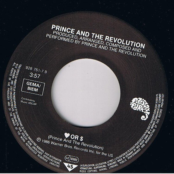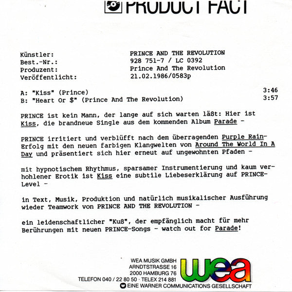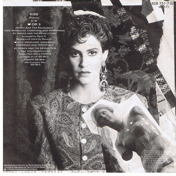 Cover: "Kiss" from the 4thcoming Paisley Park album 16132 available on LP (925 395-1), Cassette (925 395-4) and Compact Disc (925 395-2). Manufactured in Germany by Record Service GmbH, Alsdorf Fabriqué en Allemagne par Record Service GmbH, Alsdorf [Warner Music "W" logo A Warner Communications Company Paisley Park manufactured and distributed by Warner Bros. Records Inc. © 1986 Warner Bros. Records Inc. ℗ 1986 Warner Bros. Records Inc. for the U.S. & WEA International Inc. for the world outside of the U.S. Labels: Controversy Music ASCAP ℗ 1986 Warner Bros. Records Inc. for the US Made in Germany by WEA Music GmbH [Warner logo A Warner Communications Company Side A label: From the 4thcoming Prince And The Revolution album 16132 (925 395-1) available on Paisley Park Side B label: ♥ OR $ [substitute symbols for the pronounced title Vinyl, matrix/runout: R/S Alsdorf 928751-7 [A/B are is stamped further digits and letters are etched Similar editions: [r=8397501 (glossy sleeve) Kiss (non-glossy sleeve) [this release