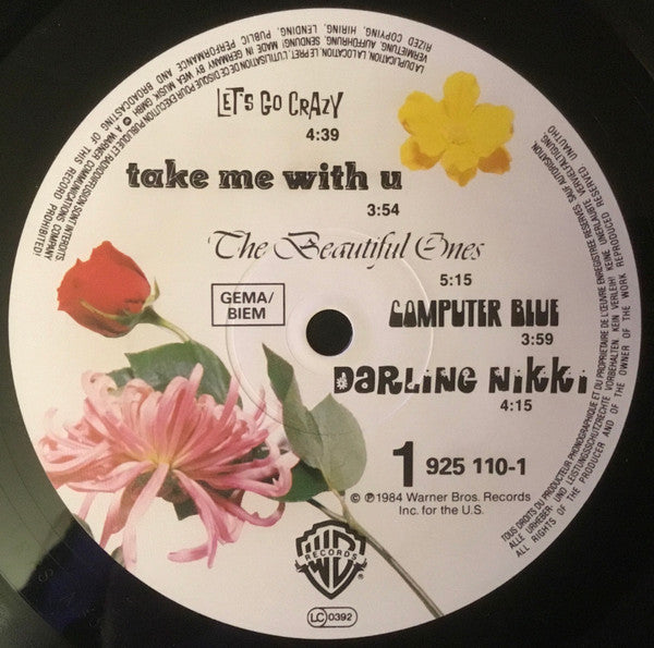 Cover: Music from the motion picture 388665 starring Prince © 1984 Warner Bros. Records Inc. ℗ 1984 Warner Bros. Records Inc. for the U.S. & WEA International Inc. for the world outside of the U.S. Manufactured in Germany by Record Service GmbH. Alsdorf Embossed [Warner "W" logo Optional purple circled sticker: BRITISH RECORD INDUSTRY AWARDS WINNER! Best Film Soundtrack Dust sleeve, face side: You can write to Prince [... London Dust sleeve, lake side: [lyrics & credits / including the (sometimes absent) extra credits for 'Computer Blue' "Darling Nikki" was recorded at a place very close 2 where u live Labels: © ℗ 1984 Warner Bros. Records Inc. for the U.S. Made in Germany by WEA Musik GmbH [rim text Vinyl: For Side A the pressing plant used US mothers, galvanized by Sheffield Lab Matrix for Allied Record Company which can be identified by the appearance of a long etched string including '△ 6851' and the [Allied 'ɑ' logo-stamp. Side B was cut at Tonstudio Pfanz Vinyl, matrix/runout: R/S Alsdorf 925110-1, A2/B2 and the [Allied 'ɑ' logo are stamped the rest is etched Remarks: The cover has a slightly altered price code, one digit (of 'WE 361') is overprinted which results in 'WE 381' Labels have no publisher credits to 'Warner Bros. Music Ltd.', (for identifiers in relation to 'Gema/Biem' or 'GEMA/Biem' see thread 845649)
