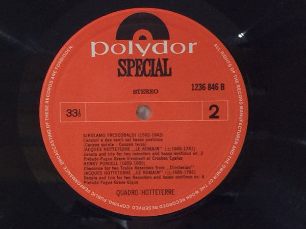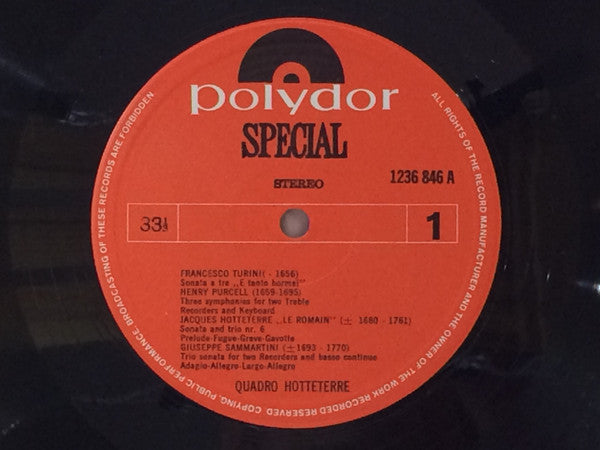 "Opgenomen door EBL Produkties in het klooster te Wittem (L.)" Recorded by EBL Productions in the Abby at Wittem (L), The Netherlands. The sleeve notes are in Dutch only. The catalog# 236 846 appears on the sleeve and 1236 846 appears on the labels. The original inner sleeve was produced in 1973, therefor the release year has been set to 1973. ---------- There is an article about/interview with the Quadro Hotteterre ensemble in Dutch music magazine Stereo Revue/Disk, it is the April issue from 1970 (nr. 39). Therefor the release year has now been set to 1970. The article mentions that the album had recently been released and that a second album is already in "statu nascendi". The catalog number in the article is Polydor 236846, selling at 12 (Dutch) guilders and 80 cents. The album gets a good review by Jan de Kruijff (8 out of 10).