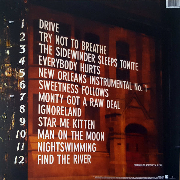 A1. Drive 4:30 A2. Try Not To Breathe 3:49 A3. The Sidewinder Sleeps Tonite 4:06 A4. Everybody Hurts 5:17 A5. New Orleans Instrumental No. 1 2:12 A6. Sweetness Follows 4:19 . Ride B1. Monty Got A Raw Deal 3:16 B2. Ignoreland 4:24 B3. Star Me Kitten 3:15 B4. Man On The Moon 5:12 B5. Nightswimming 4:16 B6. Find The River 3:49