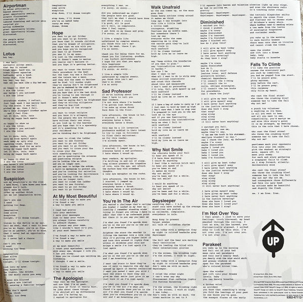 A1. Airportman 4:11 A2. Lotus 4:29 A3. Suspicion 5:35 B1. Hope 5:01 B2. At My Most Beautiful 3:33 B3. The Apologist 4:28 B4. Sad Professor 4:00 C1. You're In The Air 5:21 C2. Walk Unafraid 4:30 C3. Why Not Smile 4:02 C4. Daysleeper 3:38 D1. Diminished 4:59 D2. Parakeet 4:08 D3. Falls To Climb 5:05