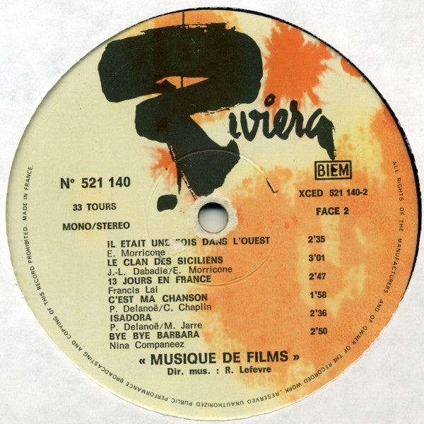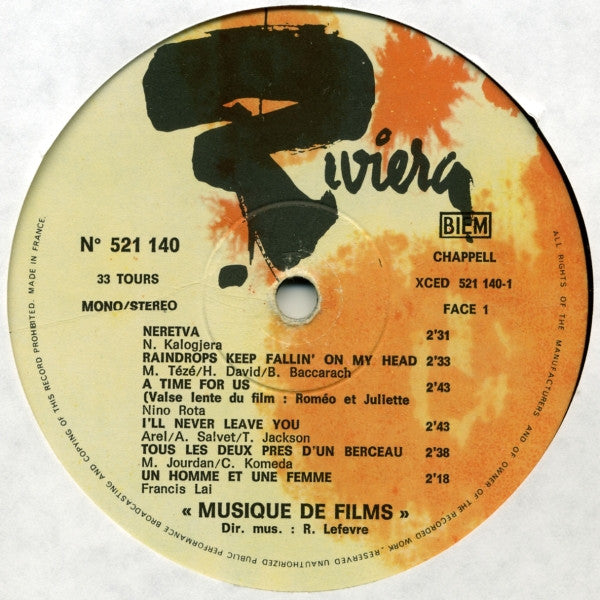 A1. Neretva 2:31 A2. Raindrops Keep Fallin' On My Head 2:33 A3. A Time For Us 2:43 A4. I'll Never Leave You 2:43 A5. Tous Les Deux Pres D'un Berceau 2:38 A6. Un Homme Et Une Femme 2:18 B1. Il Etait Une Fois Dans L'ouest 2:35 B2. Le Clan Des Siciliens 3:01 B3. 13 Jours En France 2:47 B4. C'est Ma Chanson 1:58 B5. Isadora 2:36 B6. Bye Bye Barbara 2:50