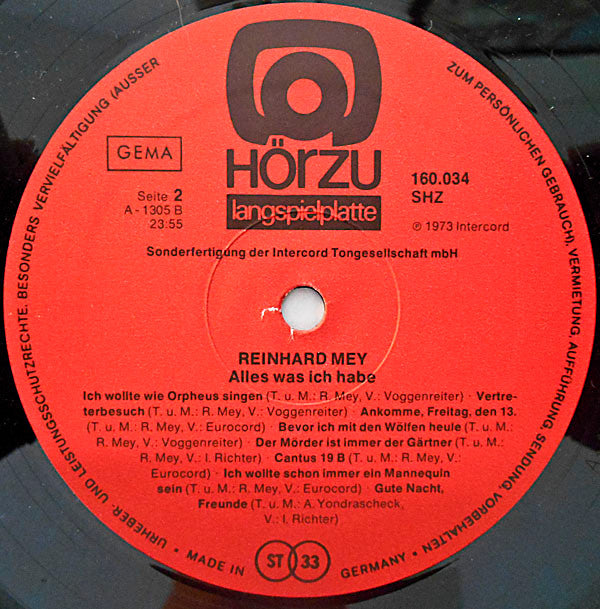 A1. Diplomatenjagd 2:58 A2. Alles Was Ich Habe 1:55 A3. Die Heiße Schlacht Am Kalten Buffet 3:16 A4. Maskerade 2:42 A5. Mädchen In Den Schänken 2:36 A6. Annabelle 4:03 A7. Hauptbahnhof Hamm 2:10 A8. Ballade Vom Pfeifer 3:36 B1. Ich Wollte Wie Orpheus Singen 2:19 B2. Vertreterbesuch 2:23 B3. Ankomme Freitag, Den 13. 4:48 B4. Bevor Ich Mit Den Wölfen Heule 2:53 B5. Der Mörder Ist Immer Der Gärtner 4:49 B6. Cantus 19 B 1:13 B7. Ich Wollte Schon Immer Ein Mannequin Sein 2:10 B8. Gute Nacht, Freunde 2:51