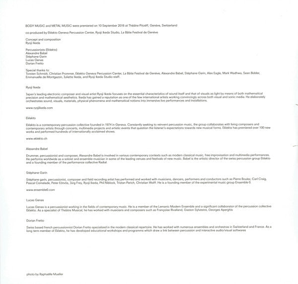 1-6: mixed and mastered May-August 2017 at Ryoji Ikeda Studio, Paris & Kyoto