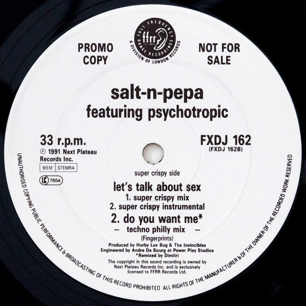 A1. Let's Talk About Sex (True Confessions Mix) 5:56 A2. Let's Talk About Sex (Girl Talk Dub) 5:36 A3. Let's Talk About Sex (Original Recipe Mix) 4:40 . Super Crispy Side B1. Let's Talk About Sex (Super Crispy Mix) 4:40 B2. Let's Talk About Sex (Super Crispy Instrumental) 4:41 B3. Do You Want Me (Techno Philly Mix) 6:31