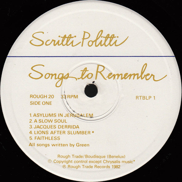 A1. Asylums In Jerusalem A2. A Slow Soul A3. Jacques Derrida A4. Lions After Slumber A5. Faithless B1. Sex B2. Rock-A-Boy Blue B3. Gettin' Havin' & Holdin' B4. The Sweetest Girl
