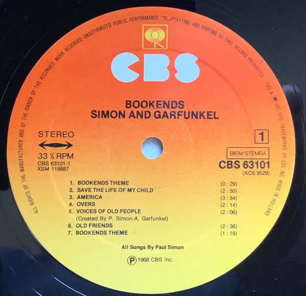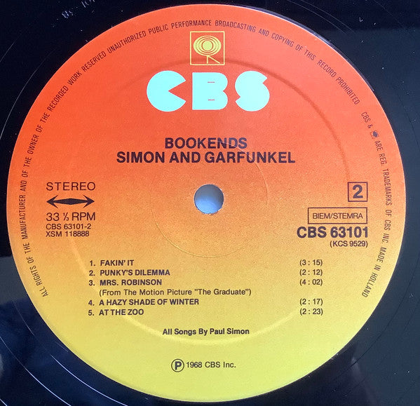 A1. Bookends Theme (Instrumental) A2. Save The Life Of My Child A3. America A4. Overs A5. Voices Of Old People A6. Old Friends A7. Bookends Theme B1. Fakin' It B2. Punky's Dilemma B3. Mrs. Robinson (From The Motion Picture "The Graduate") B4. A Hazy Shade Of Winter B5. At The Zoo