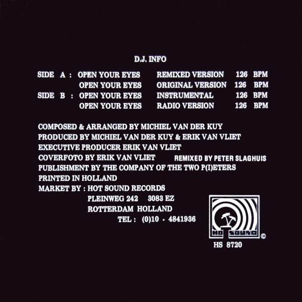 126 BPM Publishment by the Company of The Two P(i)eters Printed in Holand Marketed by: Hot Sound Records, Pleinweg 242, 3083 Ez, Rotterdam, Holland, Tel: (0)10-4841936 ℗ 1987 Version variations: Track side A1 is "Remix Version" on label and it is "Remixed Version" on back cover; track side A2 is "Orig. Version" on label and it is "Original Version" on back cover; track side B1 is "Instr. Version" on label and it is "Instrumental" on back cover. The durations are incorrect on the labels.