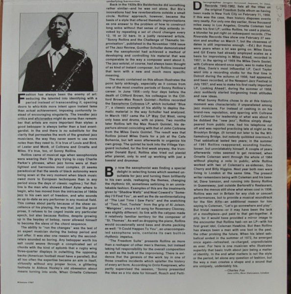 Sides 1 and 2 originally issued as Riverside 258 - Sonny Rollins - The Freedom Suite. Recorded on February 27 and March 7, 1958 (WOR recording Studios, New York City).