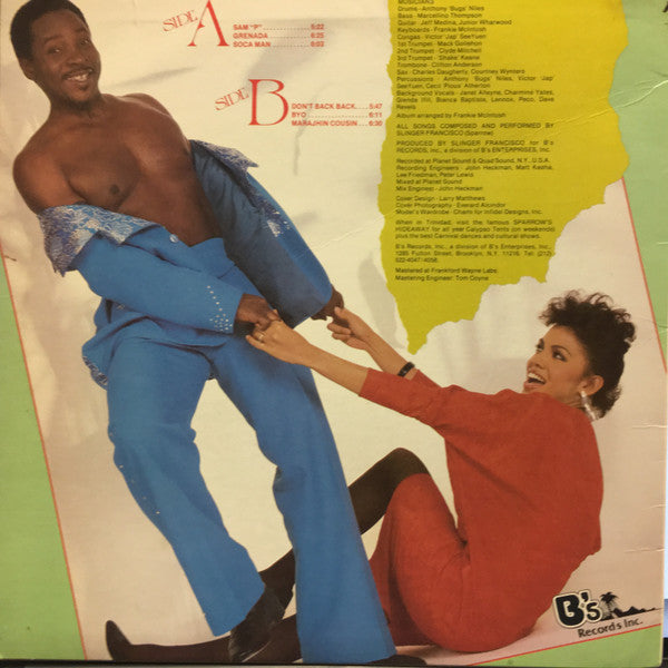 A1. Sam "P" 5:22 A2. Grenada 6:25 A3. Soca Man 6:03 B1. Don't Back Back 5:47 B2. BYO 6:11 B3. Marajhin Cousin 6:30
