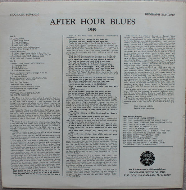 A1. St. Louis Jimmy Oden - Hard Work Boogie A2. St. Louis Jimmy Oden - Your Evil Ways A3. St. Louis Jimmy Oden - I Sit Up All Night A4. St. Louis Jimmy Oden - State Street Blues A5. Sunnyland Slim - When I Was Young (Shake It Baby) (Take1) A6. Sunnyland Slim - When I Was Young (Shake It Baby) (Take 2) B1. Eurreal Montgomery - Vicksburg Blues B2. Eurreal Montgomery - A&B Blues B3. Eurreal Montgomery - After Hour Blues B4. Eurreal Montgomery - Little Brother Stomp B5. Eurreal Montgomery - Vicksburg Blues B6. Eurreal Montgomery - No Special Rider