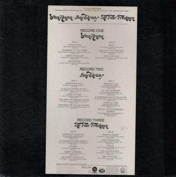 A1. Turtle Talk 5:27 A2. Stairway To The Stars 5:45 A3. Limehouse Blues 4:27 A4. Malagueña 4:23 B1. Misty 3:35 B2. Waltz Of The Prophets 6:42 B3. Body And Soul 5:16 . June Christy C1. Something Cool 4:58 C2. It Could Happen To You 2:01 C3. Lonely House 4:03 C4. This Time The Dream's On Me 1:36 C5. The Night We Called It A Day 4:54 D1. Midnight Sun 3:32 D2. I'll Take Romance 2:18 D3. A Stranger Called The Blues 4:20 D4. I Should Care 2:11 D5. Softly, As In A Morning Sunrise 2:08 . The Four Freshmen E1. Somebody Loves Me 1:37 E2. In This Whole Wide World 2:52 E3. Holiday 2:17 E4. Sweet Lorraine 2:50 E5. My Heart Stood Still 2:31 F1. Indian Summer 3:05 F2. Them There Eyes 2:28 F3. Circus 3:25 F4. It's A Blue World 3:23 F5. Mr. B's Blues 3:53