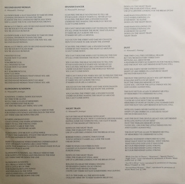 A1. While You See A Chance A2. Arc Of A Diver A3. Second-Hand Woman A4. Slowdown Sundown B1. Spanish Dancer B2. Night Train B3. Dust