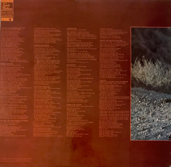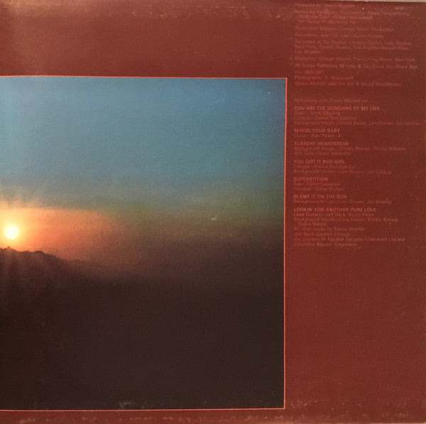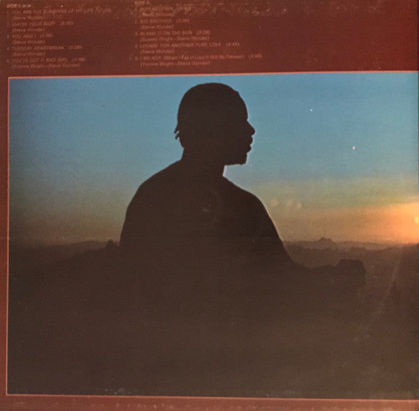 A1. You Are The Sunshine Of My Life 2:45 A2. Maybe Your Baby 6:45 A3. You And I 4:39 A4. Tuesday Heartbreak 3:09 A5. You've Got It Bad Girl 4:55 B1. Superstition 4:40 B2. Big Brother 3:55 B3. Blame It On The Sun 3:28 B4. Lookin' For Another Pure Love 4:45 B5. I Believe (When I Fall In Love It Will Be Forever) 4:48
