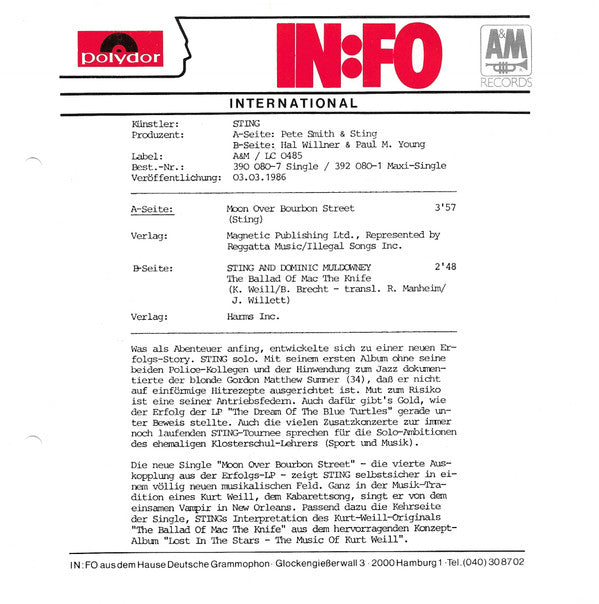 Track A: Taken from the A&M album 032708 (A&M 393 750-1). Magnetic Publ. Ltd. represented by Reggatta Music/Illegal Songs Inc. Track B: Taken from the A&M album 102057 (A&M 395 104-1). Harms Inc. ℗1985 A&M Records Inc. © 1986 A&M Records Ltd. Made In West Germany by Polygram. Distribution Polydor. Some copies were issued with an info insert.