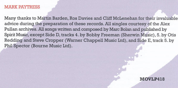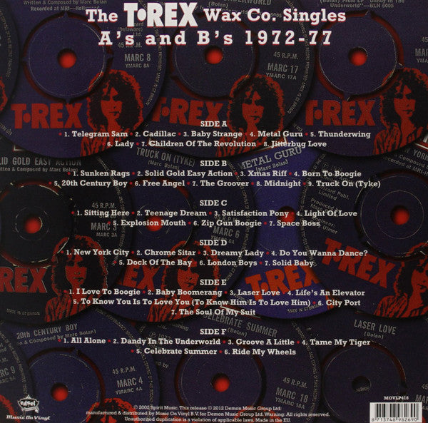 A1. Telegram Sam 3:44 A2. Cadillac 3:51 A3. Baby Strange 3:04 A4. Metal Guru 2:26 A5. Thunderwing 3:44 A6. Lady 2:11 A7. Children Of The Revolution 2:27 A8. Jitterbug Love 2:56 B1. Sunken Rags 2:51 B2. Solid Gold Easy Action 2:20 B3. Xmas Riff 0:12 B4. Born To Boogie 2:04 B5. 20th Century Boy 3:38 B6. Free Angel 2:12 B7. The Groover 3:21 B8. Midnight 2:46 B9. Truck On (Tyke) 3:06 C1. Sitting Here 2:18 C2. Teenage Dream 4:56 C3. Satisfaction Pony 2:48 C4. Light Of Love 3:14 C5. Explosion Mouth 2:26 C6. Zip Gun Boogie 3:18 C7. Space Boss 2:47 D1. New York City 3:55 D2. Chrome Sitar 3:13 D3. Dreamy Lady 2:52 D4. Do You Wanna Dance? 2:13 D5. Dock Of The Bay 2:20 D6. London Boys 2:19 D7. Solid Baby 2:36 E1. I Love To Boogie 2:14 E2. Baby Boomerang 2:16 E3. Laser Love 3:35 E4. Life's An Elevator 2:24 E5. To Know You Is To Love You (To Know Him Is To Love Him) 2:43 E6. City Port 2:41 E7. The Soul Of My Suit 2:37 F1. All Alone 2:48 F2. Dandy In The Underworld 3:49 F3. Groove A Little 3:24 F4. Tame My Tiger 2:30 F5. Celebrate Summer 2:36 F6. Ride My Wheels 2:25