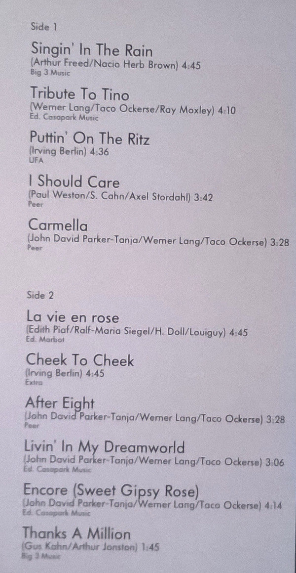 A1. Singin' In The Rain 4:45 A2. Tribute To Tino 4:10 A3. Puttin' On The Ritz 4:36 A4. I Should Care 3:42 A5. Carmella 3:28 B1. La Vie En Rose 4:45 B2. Cheek To Cheek 4:45 B3. After Eight 3:28 B4. Livin' In My Dreamworld 3:06 B5. Encore (Sweet Gipsy Rose) 4:14 B6. Thanks A Million 1:45