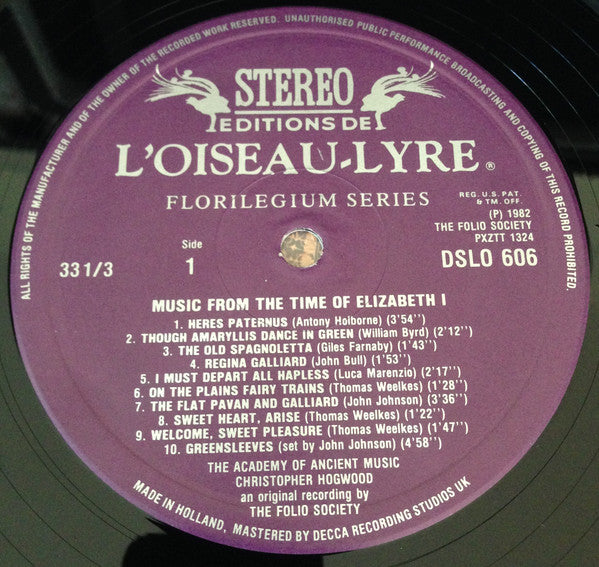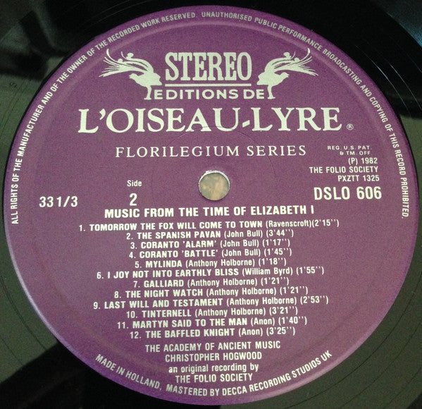A1. Heres Paternus 3:54 A2. Though Amaryllis Dance In Green 2:12 A3. The Old Spagnoletta 1:43 A4. Regina Galliard 1:53 A5. I Must Depart All Hapless 2:17 A6. On The Plains Fairy Trains 1:28 A7. The Flat Pavan And Galliard 3:36 A8. Sweet Heart, Arise 1:22 A9. Welcome, Sweet Pleasure 1:47 A10. Greensleeves 4:58 B1. Tomorrow The Fox Will Come To Town 2:15 B2. The Spanish Pavan 3:44 B3. Coranto "Alarm" 1:17 B4. Coranto "Battle" 1:45 B5. Mylinda 1:18 B6. I Joy Not In No Earthly Bliss 1:55 B7. Galliard 1:21 B8. The Night Watch 1:21 B9. Last Will And Testament 2:53 B10. Tinternell 3:21 B11. Martyn Said To The Man 1:40 B12. The Baffled Knight 3:25