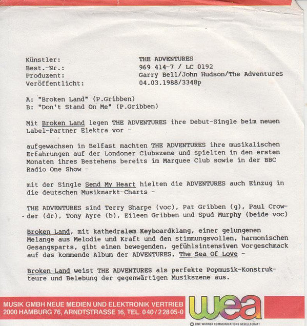 Elektra/Asylum Records A Division of Warner Communications Inc. ℗ 1988 WEA International Inc. © WEA International Inc. Chrysalis Music Ltd. Made in Germany by WEA Musik GmbH · A Warner Communications Company Manufactured in Germany, Pressé en Allemagne. Record Service GmbH, Alsdorf A Warner Communications Company Broken Land (From the album "The Sea of Love"). Don't Stand On Me (Previously Unreleased).