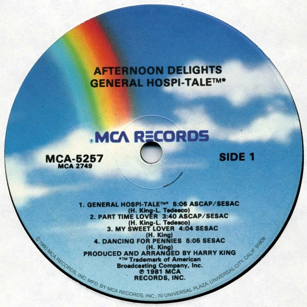 Recorded and mixed at Eastern Sound Studios, Pleasant Valley, Methuen, Mass. Mastered at Masterdisk, New York A Skys The Limit [logo Production © 1981 MCA Records, Inc. ℗ 1981 MCA Records, Inc. Some covers are gold stamped as promotional. Similar to [r20236261 but these labels have "Afternoon Delights" above "General Hospi-tale TM*".