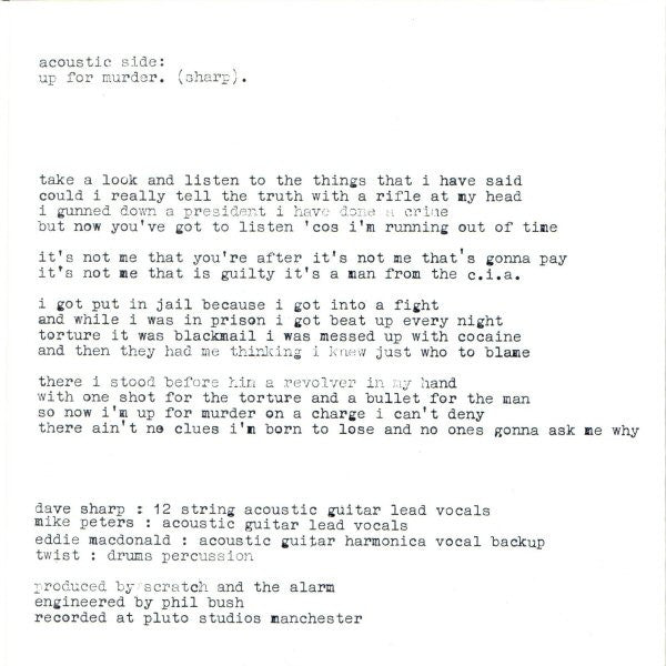 Single came in a white sleeve with a three panel wraparound sleeve. The label name does not feature on the release, but is usually referred to as White Cross due to the symbol on both label and sleeve. produced by scratch and the alarm recorded at pluto studios manchester artwork by simon shaw this is for gaz