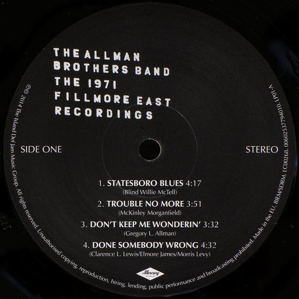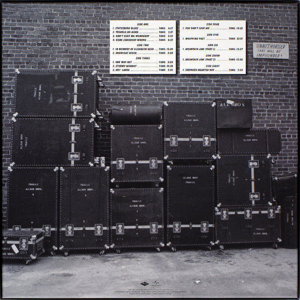 A1. Statesboro Blues 4:17 A2. Trouble No More 3:51 A3. Don't Keep Me Wonderin' 3:32 A4. Done Somebody Wrong 4:32 B1. In Memory Of Elizabeth Reed 13:20 B2. Midnight Rider 3:00 C1. One Way Out 5:03 C2. Stormy Monday 10:28 C3. Hot 'Lanta 5:26 D. You Don't Love Me 19:25 E. Whipping Post 22:51 F. Mountain Jam (Part 1) 19:37 G. Mountain Jam (Part 2) 15:06 H. Drunken Hearted Boy 7:33