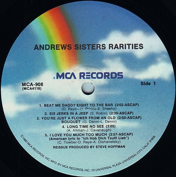 A1. Beat Me Daddy Eight To The Bar 3:02 A2. Six Jerks In A Jeep 2:39 A3. You're Just A Flower From An Old Bouquet 2:50 A4. Long Time No See 3:05 A5. I Love You Much Too Much 2:57 B1. Boogie Woogie Bugle Boy 2:38 B2. A Jitterbug's Lullaby 2:49 B3. Six Times A Week And Twice On Sunday 2:34 B4. Hit The Road 2:30 B5. Don't Fence Me In 3:01