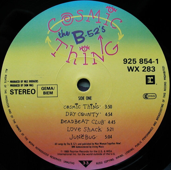 A1. Cosmic Thing 3:50 A2. Dry County 4:54 A3. Deadbeat Club 4:45 A4. Love Shack 5:21 A5. Junebug 5:04 B1. Roam 4:45 B2. Bushfire 4:58 B3. Channel Z 4:49 B4. Topaz 4:20 B5. Follow Your Bliss 4:08