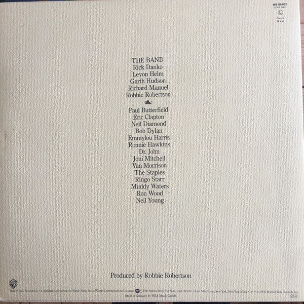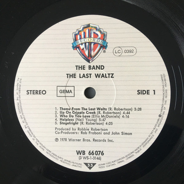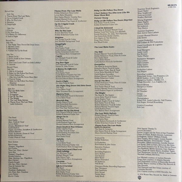 A1. Theme From The Last Waltz 3:28 A2. Up On Cripple Creek 4:44 A3. Who Do You Love 4:16 A4. Helpless 5:47 A5. Stagefright 4:25 B1. Coyote 5:50 B2. Dry Your Eyes 3:57 B3. It Makes No Difference 6:48 B4. Such A Night 4:00 C1. The Night They Drove Old Dixie Down 4:34 C2. Mystery Train 4:59 C3. Mannish Boy 6:54 C4. Further On Up The Road 5:08 D1. Shape I'm In 4:06 D2. Down South In New Orleans 3:06 D3. Ophelia 3:53 D4. Tura Lura Lural (That's An Irish Lullaby) 4:15 D5. Caravan 6:02 E1. Life Is A Carnival 4:32 E2. Baby Let Me Follow You Down 3:00 E3. I Don't Believe You (She Acts Like We Never Met) 3:23 E4. Forever Young 4:42 E5. Baby Let Me Follow You Down (Reprise) 2:46 E6. I Shall Be Released 3:53 . The Last Waltz Suite: F1. The Well 3:27 F2. Evangeline 3:17 F3. Out Of The Blue 3:08 F4. The Weight 4:38 F5. The Last Waltz Refrain 1:28 F6. Theme From The Last Waltz 3:22