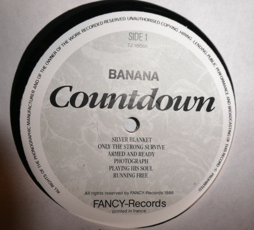 Sleeve mislabels the recording date. Recorded live on October 29th, 1986. Labels have fake song titles etc, pretending the LP is "Countdown" by "Banana" or vice versa.